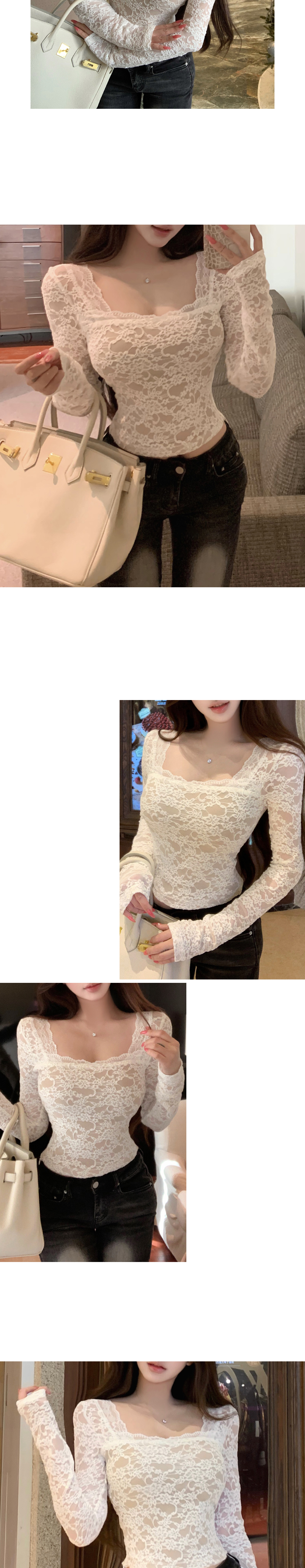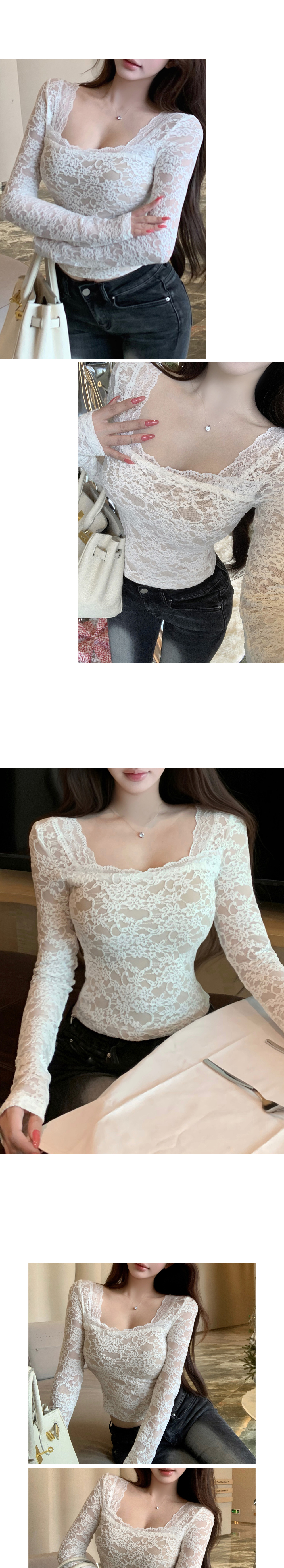 쇄골라인 돋보이는 와이드넥 레이스 소재와 스킨색 안감으로 여성스러움 완성-